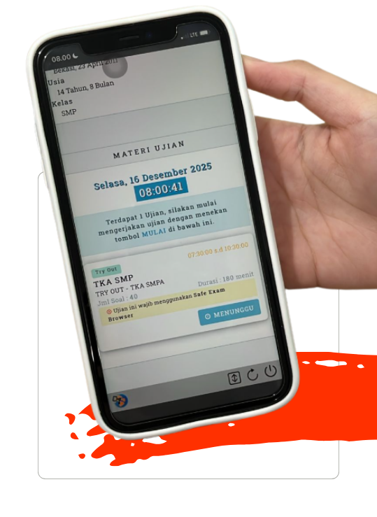 Ujian bisa dilakukan dengan berbagai perangkat melalui smartphone, laptop, atau komputer lab. Bisa dilakukan multi kelas & multi sesi, serta dapat dipantau ujian secara real-time